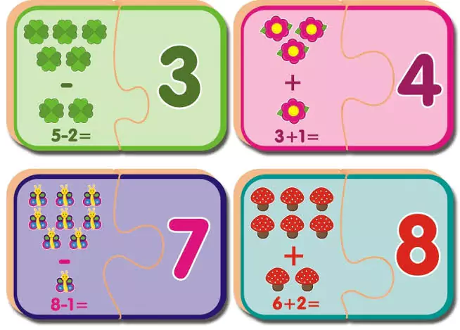 Jogo pedagógico, onde a criança vai aprender as primeiras noções de adição e subtração. Primeiro ela conta as figuras e realiza a operação matemática, depois encaixa o número correspondente ao resultado. Encaixes diferentes.