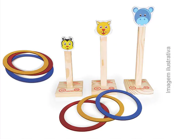 Como jogar:Monte cada pino encaixando a haste no horificio de cada base, conforme a pontuação e disponha formando uma fila lado a lado ou um na frente do outro por tamanho e distribua duas argolas para cada participante (uma de cada tamanho, até 3 participantes). Nas bases há um número dentro de círculos de tamanhos diferentes, representando as argolas maiores e as argolas menores, conforme a dificuldade.